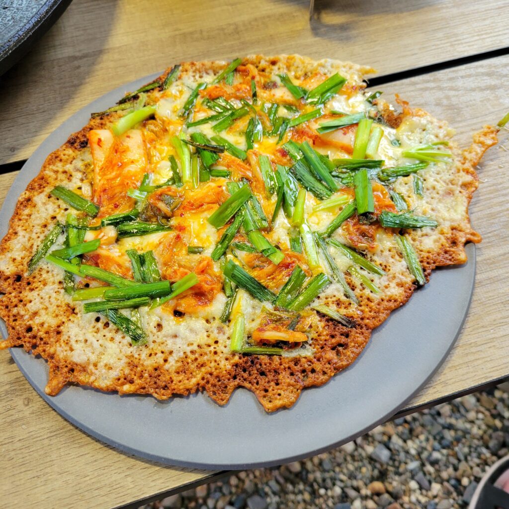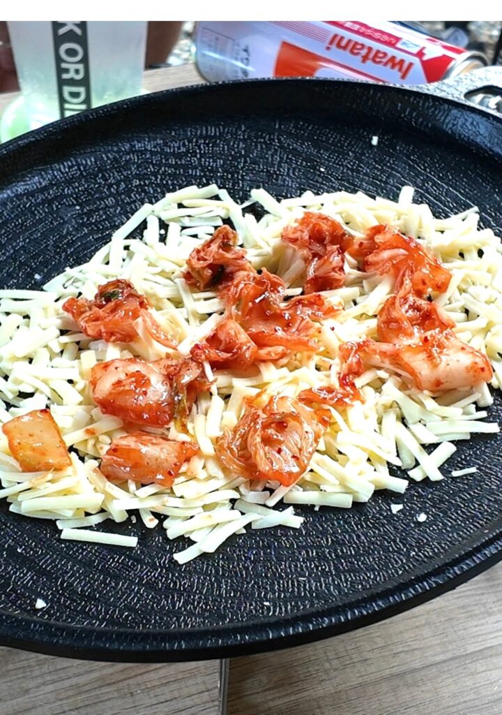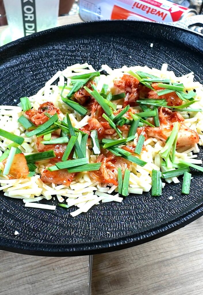 チーズを敷き詰めて、キムチとニラをのせるだけ!さっそくキャンプで作ってみました。